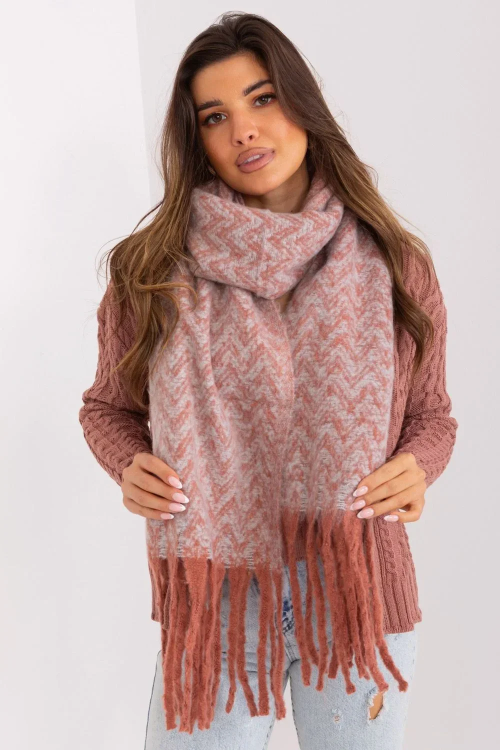 Ten dlouhý šátek s geometrickým vzorem je skvělým doplňkem do tvé podzimní a zimní garderóby. Vyrobený z odolného polyesteru, je nejen praktický, ale také stylový. Geometrický vzor dává šátku moderní a atraktivní vzhled, což ho skvěle ladí s různými outfitovými styly. Franže mu dodávají jemnost a lehkost. Délka šátku umožňuje různé způsoby nošení, můžeš ho zavinout kolem krku, nechat volně viset na ramenou nebo ho použít jako další vrstvu v chladnějších dnech. Bez ohledu na to, jak ho nosíš, tento šátek bude stylovým doplňkem tvé garderóby, přidávající charakter a teplo.