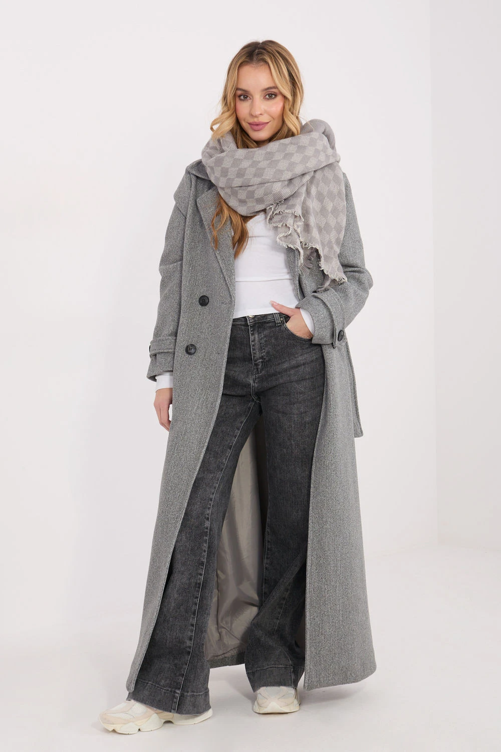 Šátek vyrobený z vysoce kvalitní směsi viskózy a vlny ohromuje příjemnou v doteku strukturou a elegantním zpracováním. Jeho geometrický, dominující vzor dodává celku moderní charakter. Model má impozantní rozměry 148 × 148 cm, díky čemuž ho lze nosit různými způsoby, jak jako klasický šátek, tak jako stylový šátek. K jeho šarmu přispívají jemné franže, které zdůrazňují lehkost a svobodu stylizace.