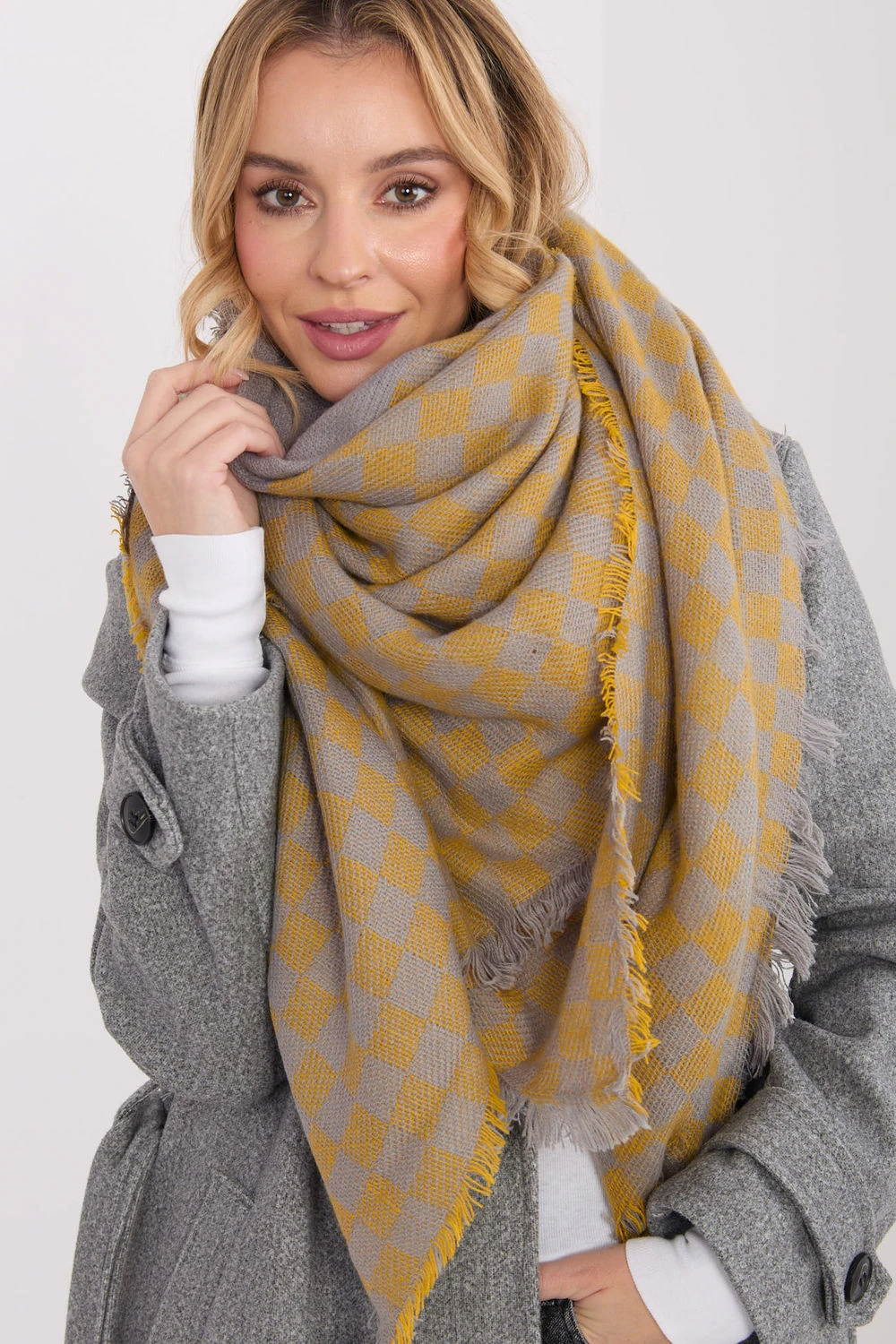 Šátek vyrobený z vysoké kvality směsi viskózy a vlny okouzlí příjemnou strukturou na dotek a elegantním zakončením. Jeho geometrický, dominující vzor dodává celku moderní charakter. Model má impozantní rozměry 148 × 148 cm, díky čemuž ho lze nosit mnoha způsoby, jak jako klasický šátek, tak stylový šátek. Dalšímu kouzlu dodávají jemné franže, které zdůrazňují lehkost a volnost stylizace.