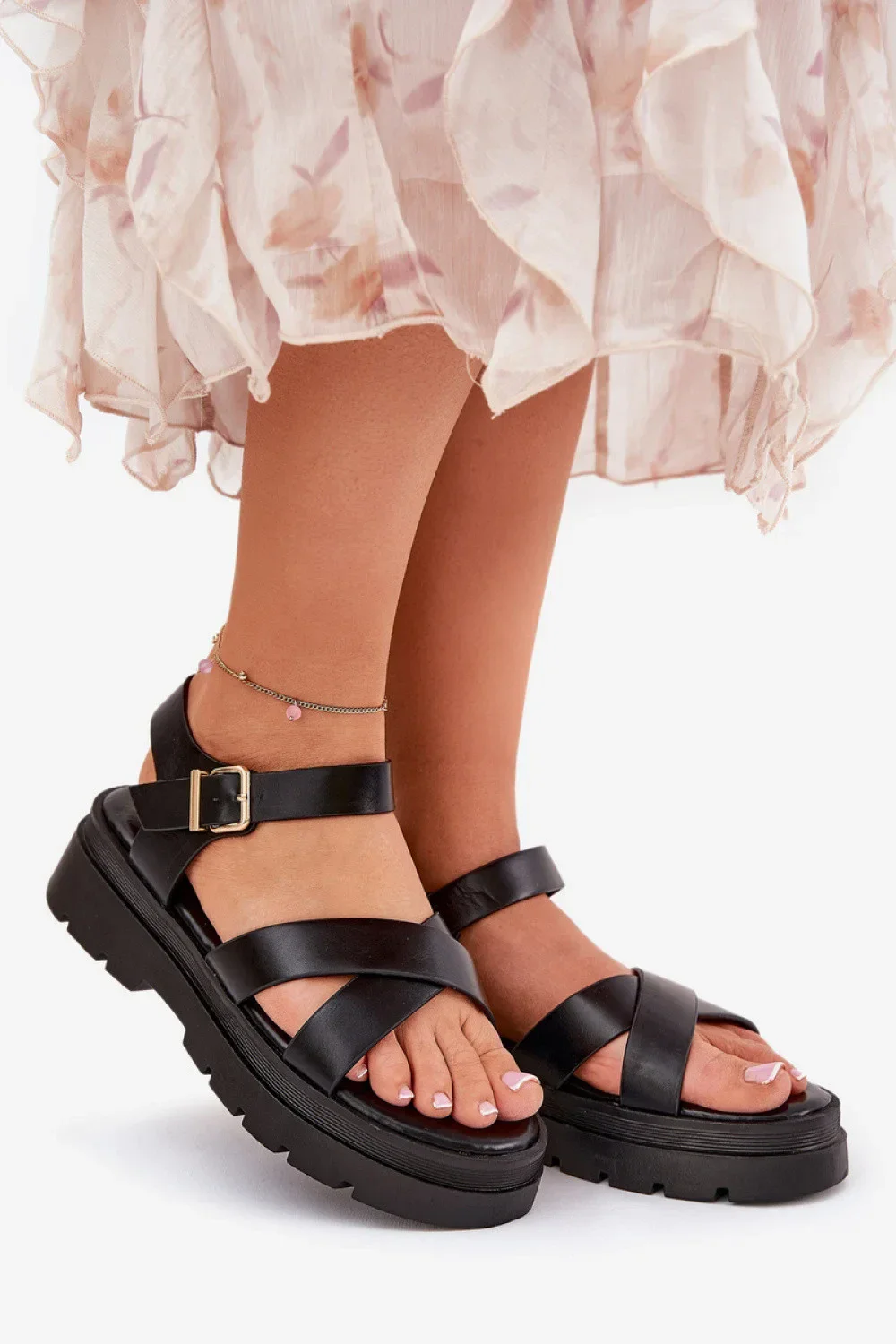 Elegantní dámské sandály vyrobené z ekokože. Umístěné na platformě. V přední části jsou dva propletené popruhy, které dodávají zvláštní charakter. Zapínají se na přezku kolem kotníku, což zajišťuje ideální přizpůsobení. Skvělé na teplé dny, skvěle ladí s šaty, sukněmi a kalhotami.