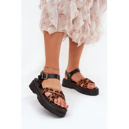 Stylové dámské sandály vyrobené z ekokože a ekosuede. Umístěné na platformě. Vepředu jsou dva propletené popruhy, které dodávají výjimečný charakter. Zapínají se na sponu kolem kotníku, zajistí ideální přizpůsobení. Skvělé na teplé dny, skvěle se hodí k šatům, sukním a kalhotám.
