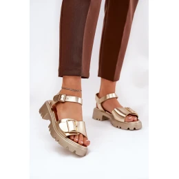 Elegantní dámské sandály vyrobené z ekokože, umístěné na platformě a s plochým podpatkem, které poskytují pohodlí a stabilitu. Přední část bot je zdobená velkou zlatou sponou, která jim dodává jemnou eleganci a charakter. Zapínají se na nastavitelný pásek s přezkou, což umožňuje ideální přizpůsobení se noze. Tyto sandály jsou skvělou volbou na teplé dny, hodí se jak k šatům, tak k kalhotám, spojující styl a pohodlí v každém outfitu.