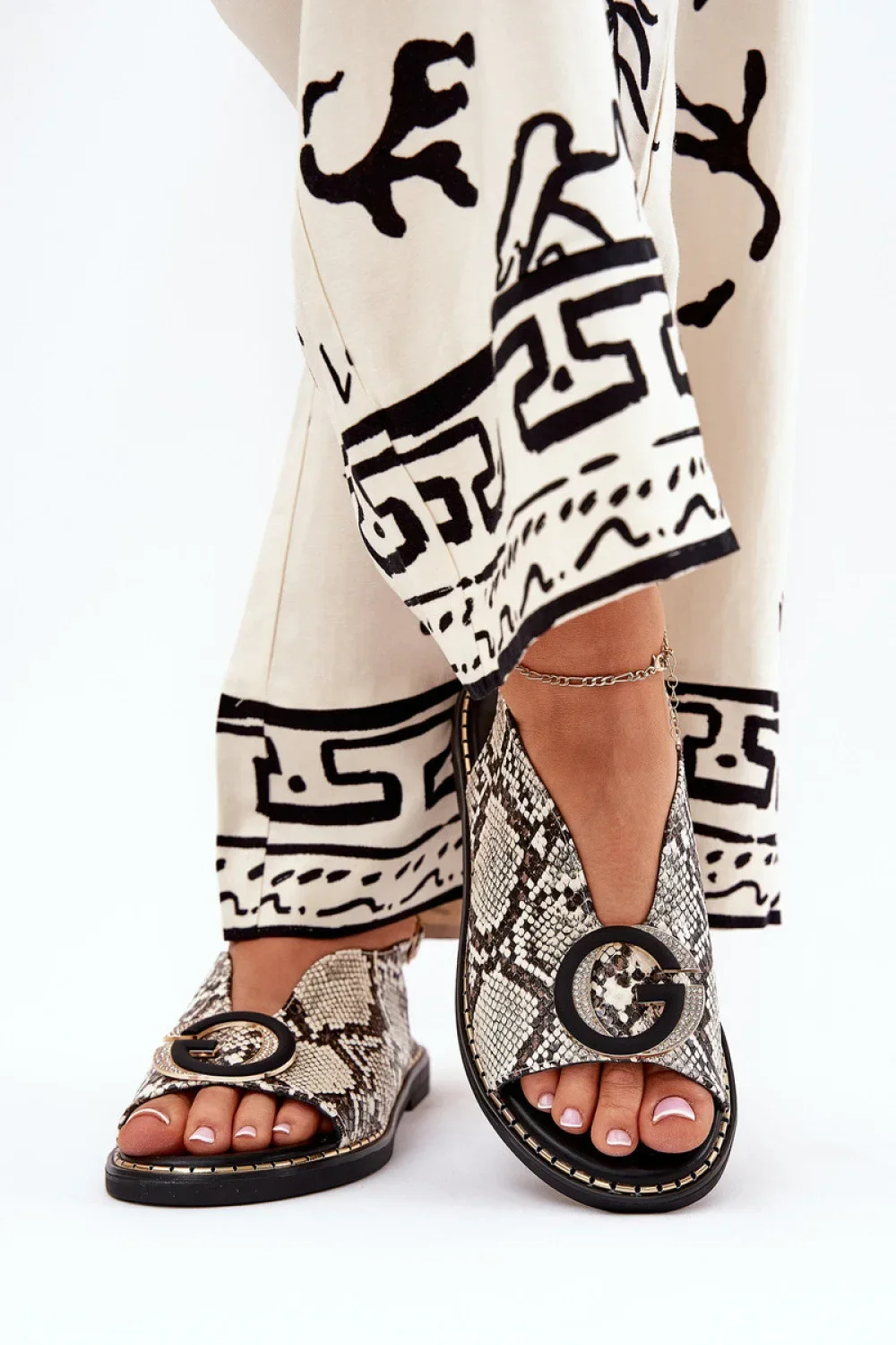 Ploché dámské sandály jsou vynikající volbou na letní dny. Vpředu mají ozdobu, která jim dodává jemné kouzlo, a nastavitelný popruh se sponou umožňuje dokonalé přizpůsobení noze. Ekologická kožená vložka zajišťuje komfort po celý den. Tyto sandály spojují styl s funkčností a představují vynikající doplněk jak pro každodenní, tak i pro elegantnější styling.