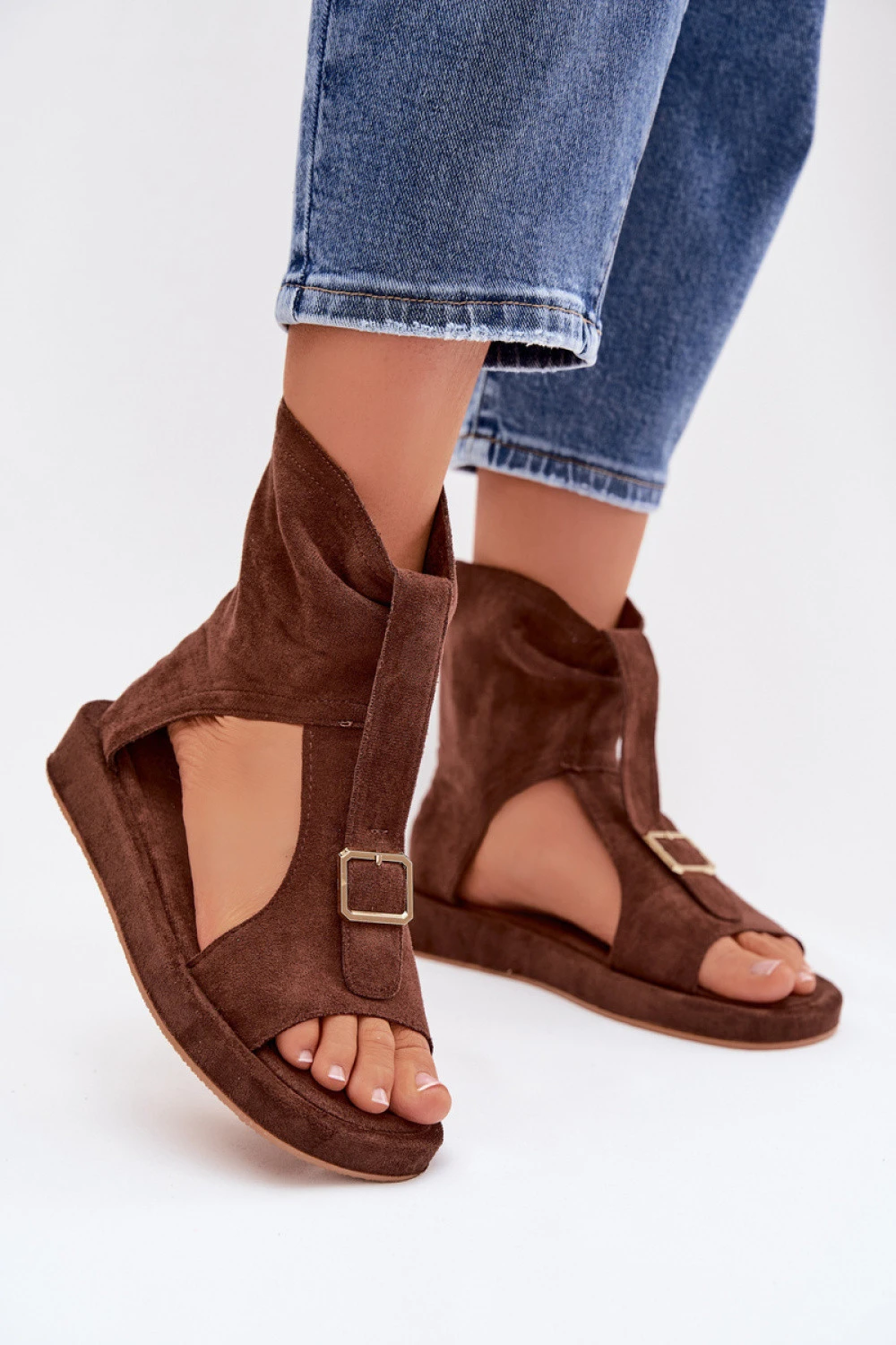 Sandály z ekosuede jsou stylovým návrhem pro teplé dny a speciální příležitosti. Měkký materiál jim dodává decentní vzhled, a zápěstí zapínání na zip zajišťuje pohodlí a rychlé oblékání. Přední část boty zdobí efektní pásek s zlatou přezkou, který přitahuje pohled a celku dodává eleganci. Tento model skvěle doplní jak každodenní, tak elegantní stylizace.