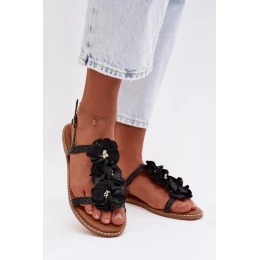 Elegantní dámské sandály z ekokože se vyznačují elegantním zpracováním lemovaným lesklým nitěm, které jim dodává jemný lesk. Nastavitelný popruh se sponou umožňuje ideální přizpůsobení noze. Největší výhodou modelu jsou efektní materiálové květy, které jsou dekorativním prvkem přitahujícím pozornost a zdůrazňujícím ženský charakter obuvi. Měkká stélka zajišťuje pohodlí při nošení po celý den, díky čemuž se sandály skvěle hodí do letních stylizací.