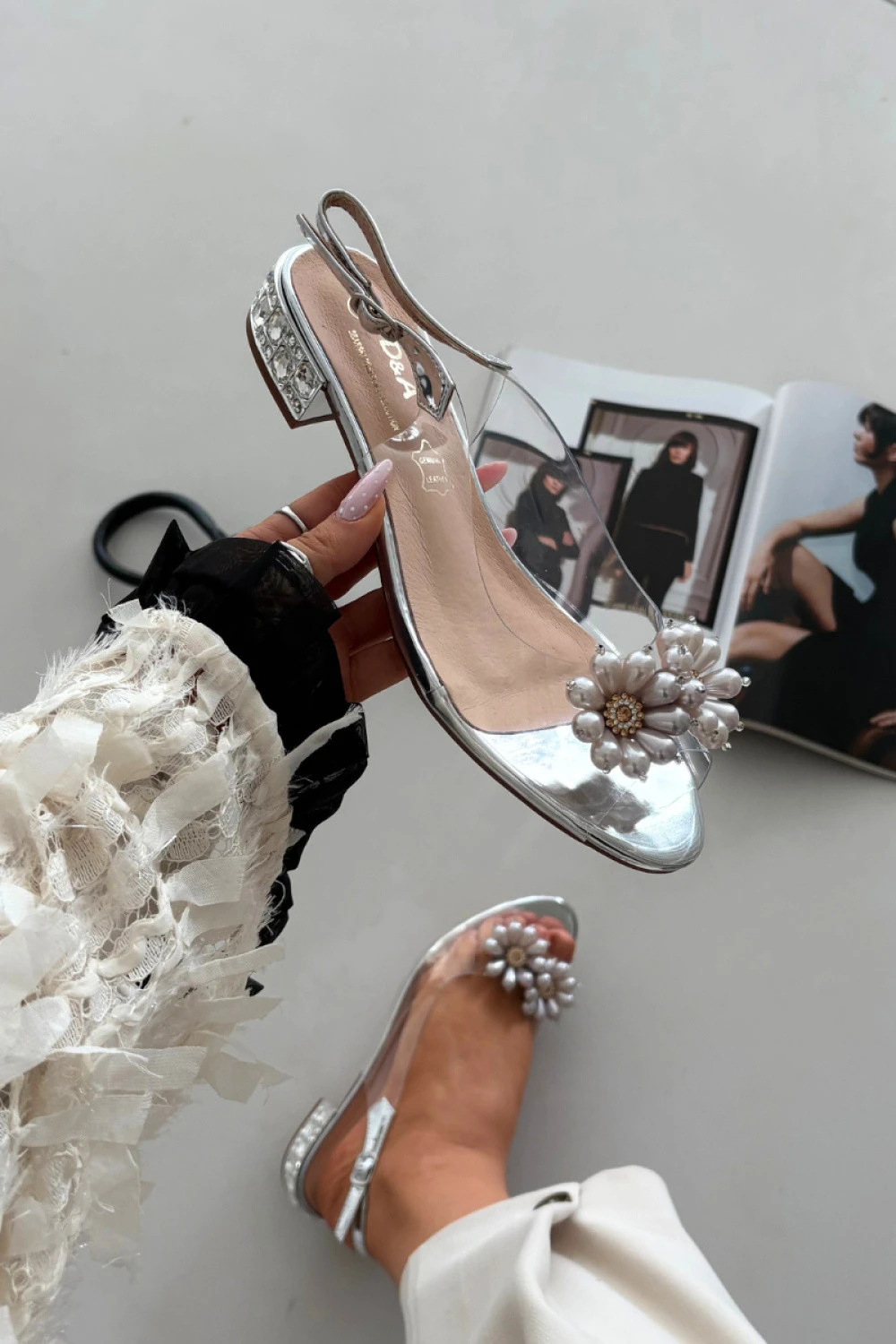 Jemné a neuvěřitelně ženské průsvitné sandály jsou ideální volbou pro elegantní výstupy a speciální události. Na přední straně jsou zdobeny dvěma jemnými květinky. Nízký podpatek zdobený krystalky krásně odráží světlo, přidávajíc eleganci a bižuterní efekt. Model se zapíná na přezku s nastavitelným páskem, což umožňuje ideální přizpůsobení noze, zajišťující pohodlí a stabilitu nošení. Je to skvělá volba pro šaty, večerní stylizace a slavnostní události, kde záleží na jemnosti, detailu a ženském šiku.