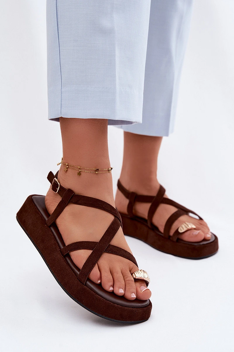 Módní dámské sandály vyrobené z příjemného na dotek eko semiše jsou skvělou volbou na teplejší dny. Stylový tvar na platformě nejenže přidává několik centimetrů výšky, ale také zajišťuje pohodlí a stabilitu při každodenním nošení. Model s pásky krásně sedí na noze, zvýrazňuje její tvar a dodává lehkost celému stylingu. Zlatý detail umístěný u prstů je elegantní akcent, který přitahuje pozornost a dodává jedinečný charakter. Měkká vložka zaručuje pohodlí při nošení i po mnoho hodin, takže model je vhodný jak na každý den, tak na letní výlety nebo dovolené. Při výběru velikosti se řiďte tabulkou velikostí.