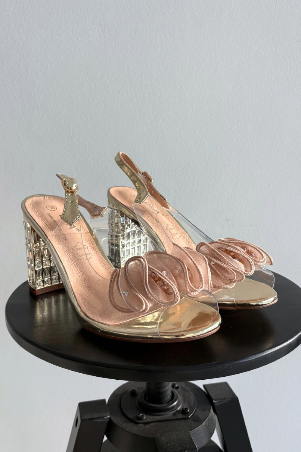 Elegantní průhledné dámské sandály jsou stylovým návrhem na speciální příležitosti. Stabilní sloupkový podpatek zdobený třpytivými krystalky dodává celku šperkový charakter a jemně přitahuje pozornost. Jemná síťovina vpředu. Model se zapínáním na přezku s nastavitelným popruhem umožňuje ideální přizpůsobení noze, zajistí pohodlí a jistotu nošení. Sandály skvěle doplní večerní, koktejlové a elegantní šaty, zdůrazňujíce ženský styl a péči o detaily.