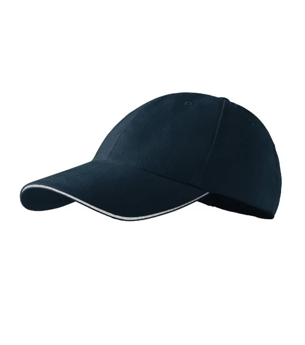 šestipanelový střih vyztužené 2 přední panely prošívaný, lehce prohnutý kšilt s konstrastním proužkem obšité větrací otvory potící páska velikost nastavitelná mosazným klipem