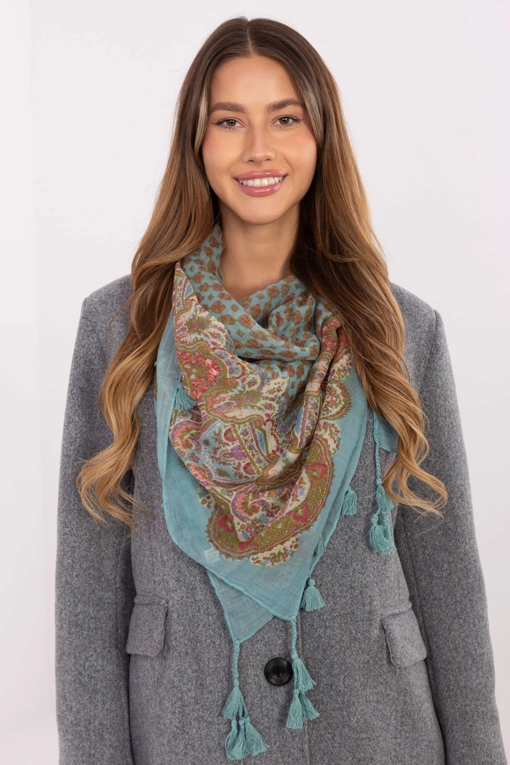 Šátek s zajímavým potiskem a lemováním je módním a univerzálním doplňkem, který dodá charakter každému outfitu. Efektní vzor přitahuje pozornost a oživuje jak jednoduché, tak klasické kombinace. Čtvercový formát o rozměrech 110 × 110 cm umožňuje volně stylizovat šátek různými způsoby – nošením kolem krku, přes ramena, jako šátek na ramenech nebo jako doplněk k tašce. Lemování frčílky dodává lehkost a jemný, boho charakter, čímž z ní činí ideální volbu jak na každý den, tak na speciální příležitosti.