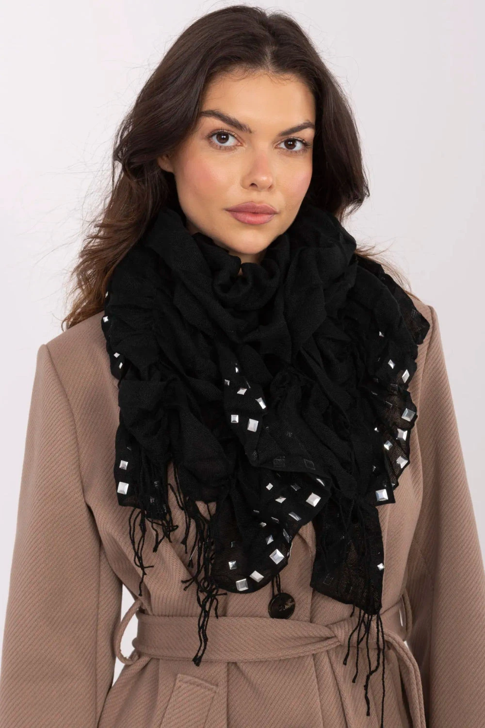 Elegantní šála s břitvami a ozdobnými nýtky je efektním doplňkem, který skvěle doplní jak každodenní, tak výraznější stylizace. Vyrobená z lehké a příjemné viskózy se jemně skládá na krku nebo ramenou, poskytující pohodlí při nošení. Model o rozměrech asi 134 cm délky a 47 cm šířky nabízí mnoho možností stylizace, lze ji nosit klasicky, volně přehozenou nebo svázanou různými způsoby. Dekorativní břitvy a decentní nýtky dodávají šále módní charakter a upoutávají pozornost, činí z ní výjimečný doplněk každé stylizace.