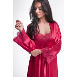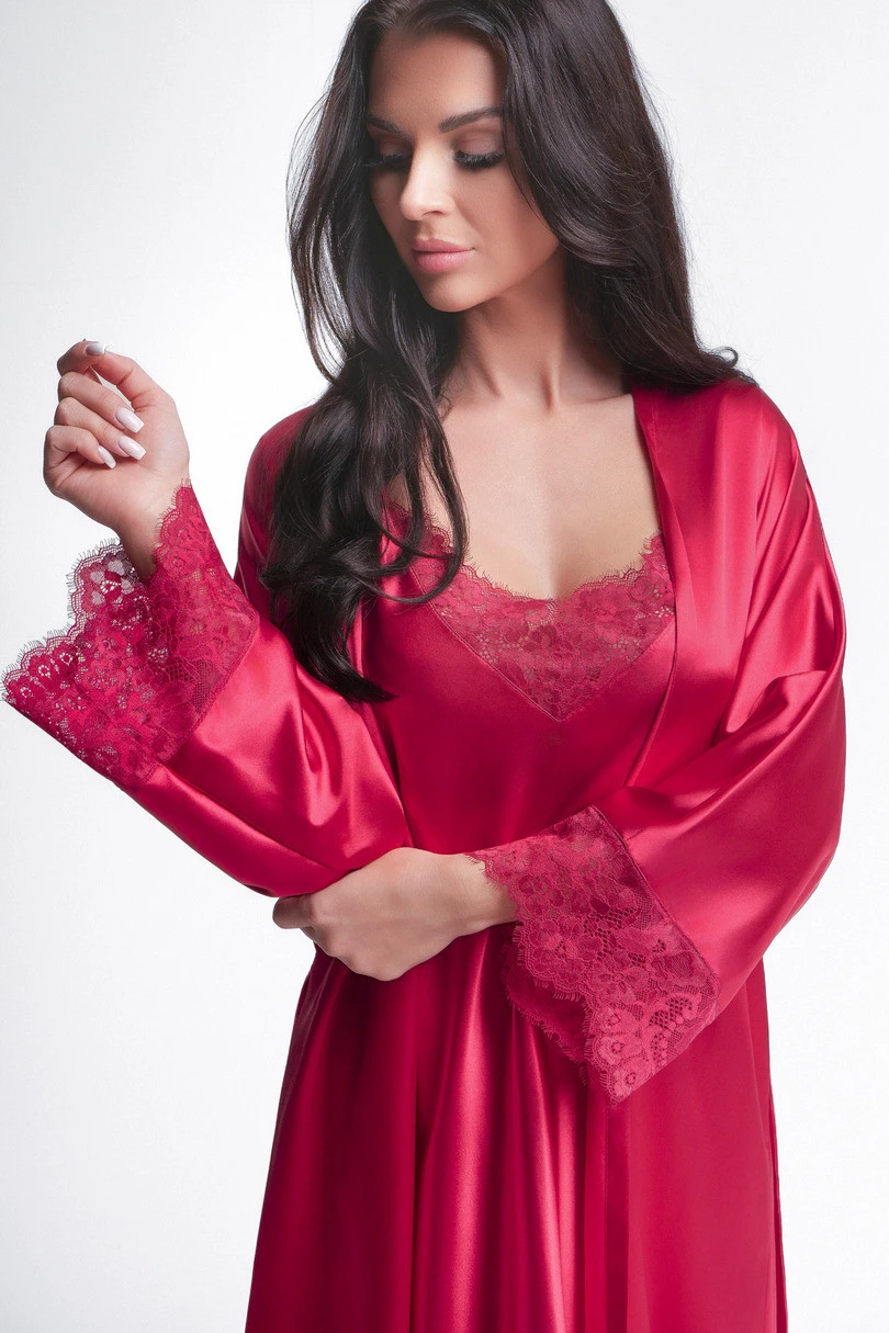 Krátký červený saténový župan s krajkou na rukávech je mimořádně elegantní a smyslnou nabídkou pro ženy, které ocení luxusní noční prádlo. Je vyroben z hladkého lesklého saténu, krásně sedí na postavě a zajišťuje vysoký komfort nošení. Jemná krajka zdobící rukávy dodává celku jemnou lehkost a ženský charakter.