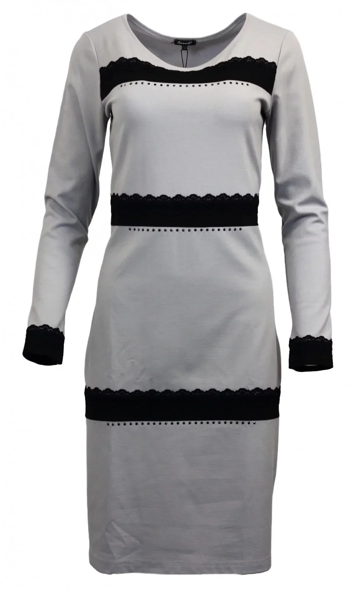 Dámské šaty s dlouhým rukávem, zdobené černou krajkou.