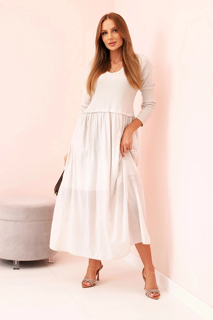 Lehká dámská šaty ušité z příjemné na dotek bavlněné pleteniny, která se krásně přizpůsobí postavě. Horní část z žebrovaného materiálu zvýrazňuje ženskou linii, zatímco spodní část s mírně nařaseným zakončením dodává lehkost. Hluboký V výstřih opticky prodlužuje krk a dlouhý rukáv zajišťuje pohodlí v chladnějších dnech.