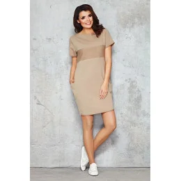 Dámské šaty s kulatým výstřihem, krátkými rukávy, bočními kapsami a širokým pruhem přes hruď. Délka nad kolena,