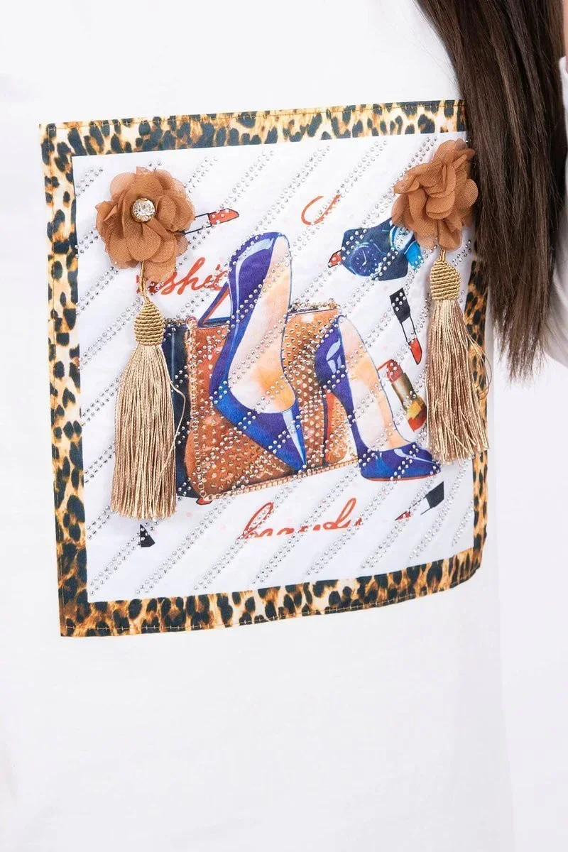 Představujeme vám módní šaty. Šaty má našitou grafiku. Šaty s průstřihy na ramenou. Ideální pro každodenní použití. Šaty jsou vyrobeny z vysoce kvalitního materiálu. Velikost je univerzální a vyhovuje dámám, které nosí velikost S, M nebo L.