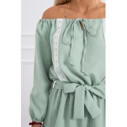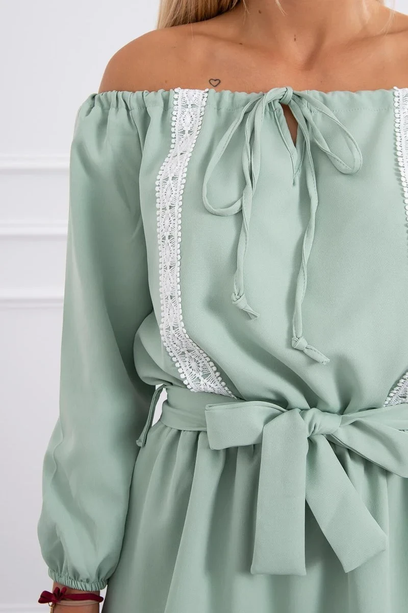 Šaty s odhalenými rameny a krajkou světle zelené barvy