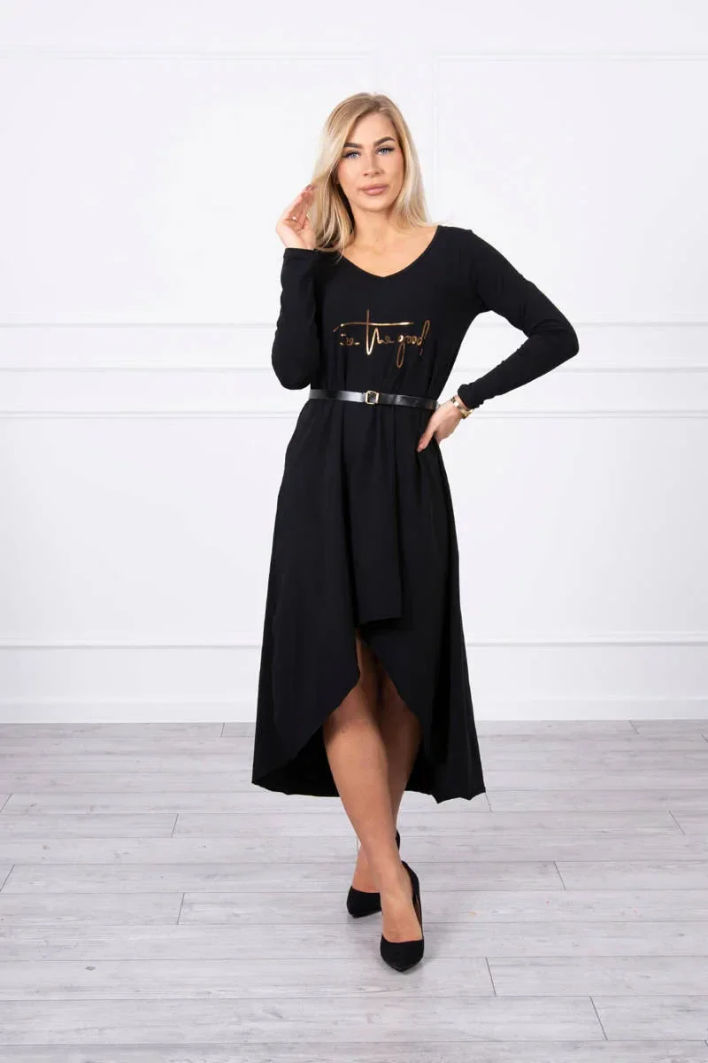 Představujeme vám pohodlné šaty s ozdobným páskem a módním nápisem na přední straně. Šaty mají delší záda. Šaty jsou vyrobeny z vysoce kvalitního materiálu. Velmi zajímavá nabídka pro všechny dámy. Velikost je univerzální a vyhovuje dámám, které nosí velikost S, M nebo L.