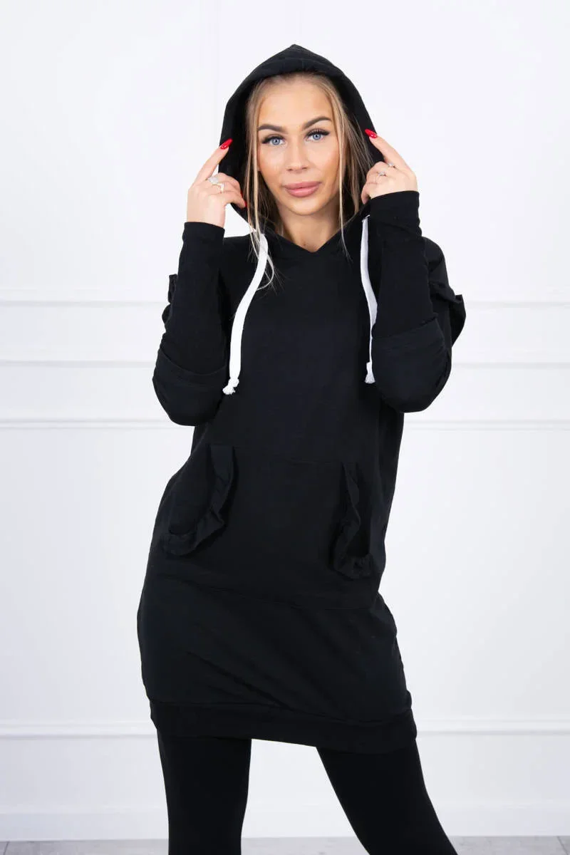 Šaty s ozdobnými volánky a kapucí černé barvy