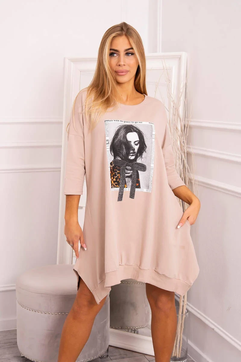 Šaty s potiskem a rozšířenou spodní částí béžové