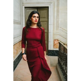 Styl: elegantní koktejlové šaty s volánem Tvar: mírně vypasovaná silueta, rovná sukně zvýrazněná ozdobnými prvky Délka: midi - pod kolena