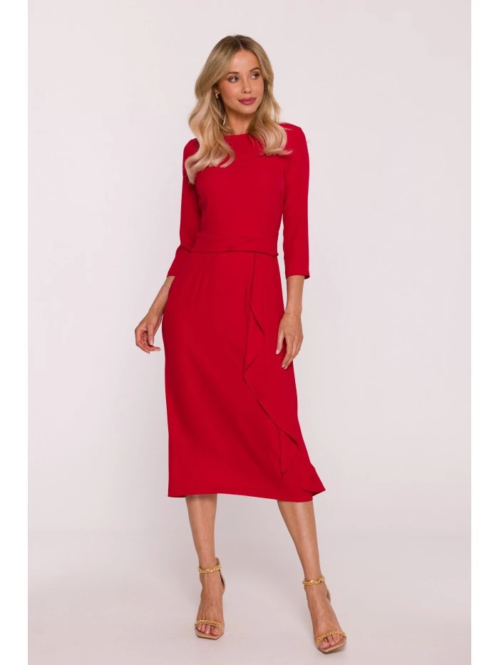Materiál: 95% polyester 5% elastan LÁTKA: hladká tkanina s jemným leskem PODROBNOSTI O PRODUKTU Výstřih: kulatý Rukávy: 3/4 délky Sukně: rovná, s ozdobným volánem podél boční linie sukně, vzadu vysoký rozparek Pas: zvýrazněný jemným střihem a látkovým překrytím Zapínání: skrytý zip na zádech Model: S425 Navrženo a vyrobeno v Polsku Modelka je vysoká 174 cm a nosí velikost S STYL A STŘIH Styl: elegantní koktejlové šaty s volánem Tvar: mírně vypasovaná silueta, rovná sukně zvýrazněná ozdobnými prvky Délka: midi - pod kolena