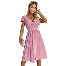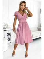 Matilde - rozevláté šaty s obálkovým výstřihem a krátkými rukávy. Vyrobené z pružné lesklé látky v barvě špinavě růžové. značka numoco. polský výrobek.