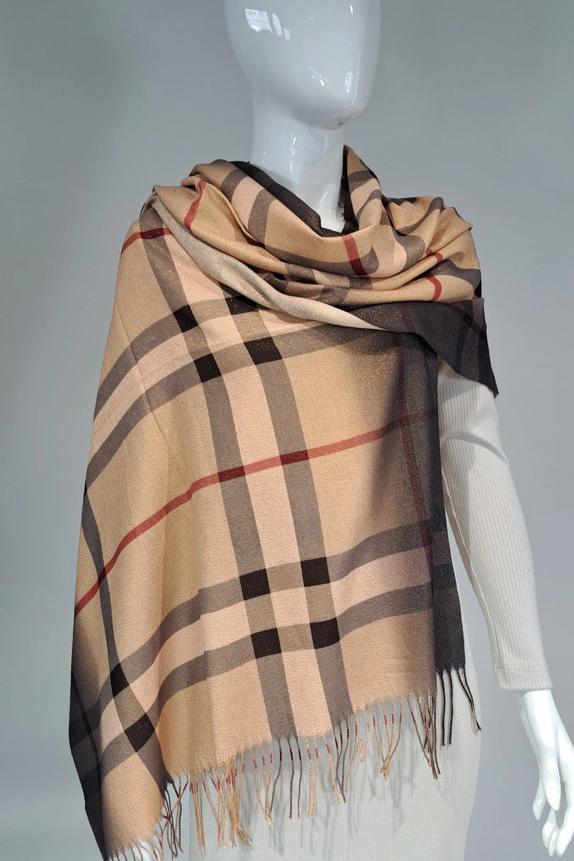 Elegancja, klasyka i subtelny blask – ten damski szal jesienny w kratę inspirowaną wzorem Burberry to kwintesencja stylu i kobiecego szyku. Wykonany z miękkiej, przyjemnej w dotyku tkaniny – 50% bawełna i 50% wiskoza – zapewnia nie tylko komfort noszenia, ale również świetną termoizolację na chłodniejsze dni. Zdobiony delikatnie wplecionymi złotymi nitkami, które tworzą subtelną, luksusową poświatę – dodaje charakteru każdej stylizacji, od codziennej po wieczorową. Frędzle wykończające szal dodają mu lekkości i ruchu. Ponadczasowy wzór w kratę sprawia, że to dodatek, który nigdy nie wyjdzie z mody. Idealny na jesień i zimę – otuli Cię ciepłem i klasą.