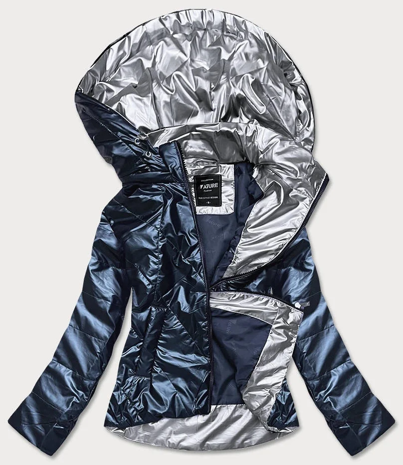 Šedomodrá dámská bunda se stříbrnou kapucí (RQW-7008)