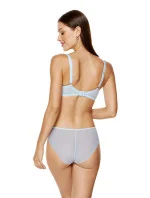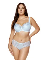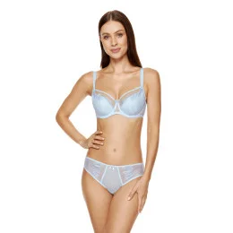Elegantní podprsenka v modré barvě. Spodní část košíčků je vyrobena z tenké korzetové pěny a horní část košíčků je z výšivky, díky které se podprsenka dokonale přizpůsobí tvaru prsou. Spodní část košíčků je z vnitřní strany potažena bavlnou podle normy OEKO-TEX, takže je šetrná k pokožce, a z vnější strany výšivkou se vzorem připomínajícím peříčka. Ozdobná mašlička na můstku. Svislé boční velrybí kostice stabilizují obvod podprsenky. Podprsenka byla navržena a ušita v Polsku.