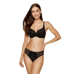 Podprsenka v černé barvě. Spodní část košíčků je vyrobena z tenké korzetové pěny potažené krajkou a horní část z krajky a tylu, díky čemuž se podprsenka dokonale přizpůsobí tvaru prsou. Zadní část podprsenky je působivě zdobená krajkou. Skvěle se hodí při asymetrii prsou. Spodní část košíčků je z vnitřní strany podšitá bavlnou OEKO-TEX šetrnou k pokožce. Svislé boční velrybí kostice stabilizují obvod podprsenky. Podprsenka byla navržena a ušita v Polsku.