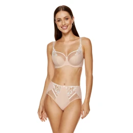 Objevte polovyztuženou podprsenku Egerie zdobenou půvabnou květinovou výšivkou. Spodní část košíčků je vyrobena z tenké korzetové pěny potažené hladkým úpletem, zatímco horní část tvoří květinová výšivka v kontrastní barvě. Skvěle se hodí při asymetrii prsou. Spodní část košíčků je z vnitřní strany potažená bavlnou OEKO-TEX šetrnou k pokožce. Svislé boční velrybí kostice stabilizují obvod podprsenky. Zadní část podprsenky je vyrobena z vyztuženého tylu. Ozdobné mašličky uprostřed a na ramínkách. Podprsenka navržena a ušita v Polsku.