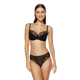 Objevte polovyztuženou podprsenku Madame zdobenou mimořádně elegantní a ženskou květinovou výšivkou. Spodní část košíčků je vyrobena z tenké korzetové pěny lemované tylem, zatímco horní část je tvořena ozdobnou výšivkou, díky níž se podprsenka dokonale přizpůsobí tvaru prsou. Spodní část košíčků je z vnitřní strany potažena bavlnou šetrnou k pokožce podle normy OEKO-TEX. Zlaté detaily dodávají podprsence elegantní nádech. Svislé boční velrybí kostice stabilizují obvod podprsenky. Zadní část podprsenky je vyrobena z tylu. Podprsenka navržena a ušita v Polsku.