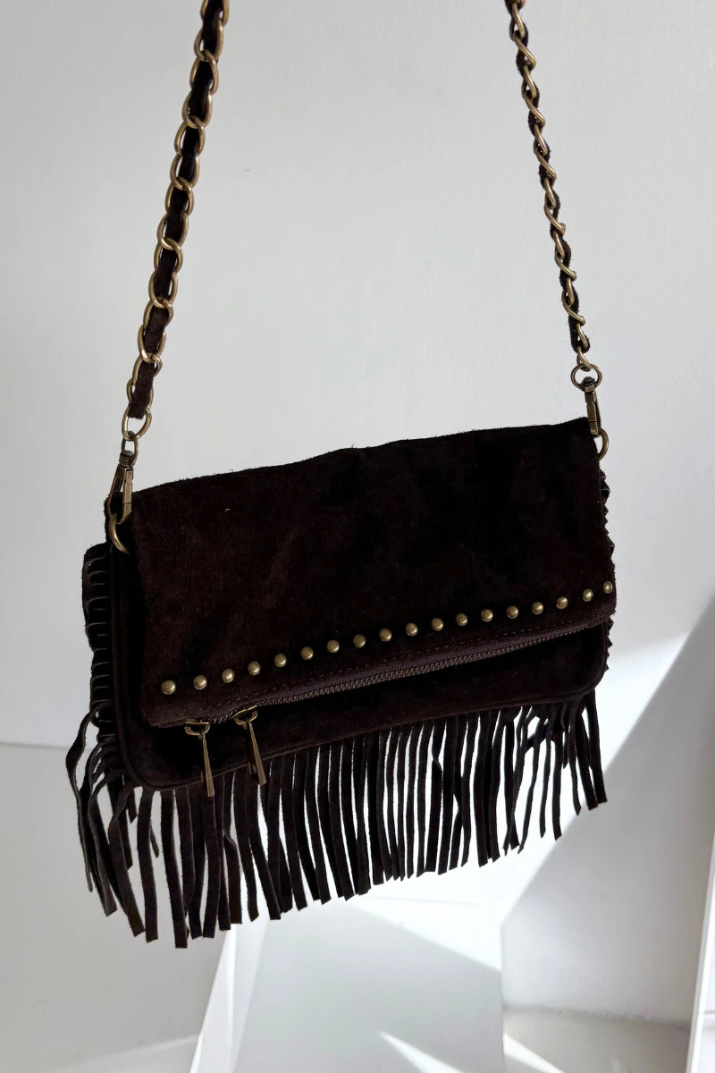 Semišová kabelka s třásněmi na řetízku čokoládová Narella
