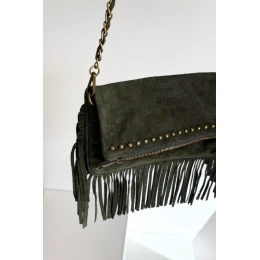 Semišová kabelka s třásněmi na řetízku tmavě zelená Narella