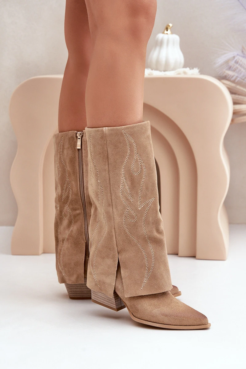 Semišové Kozačky Do Poloviny Lýtka S Otočeným Svrškem Na Podpatku Béžové Zazoo 3487