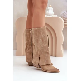 Kozačky z přírodní velurové kůže sahající do poloviny lýtek jsou výjimečně stylovou a elegantní volbou. Charakteristické špičaté špičky jim dodávají rafinovaný vzhled, zatímco obrácený svršek s ozdobnými švy představuje hlavní dekorativní prvek, který přidává originalitu a jemný kovbojský akcent. Model je zapínaný na zip, což zajišťuje pohodlí při nošení. Vynikající jak na každodenní nošení, tak na elegantnější příležitosti. Při výběru velikosti se řiďte tabulkou velikostí.