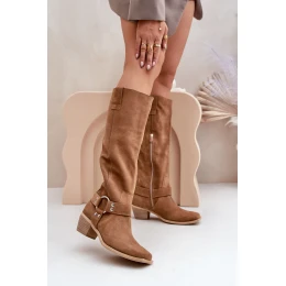 Semišové kozačky na nízkém podpatku s holeněmi nad kolenem Zazoo 3444/O Camel