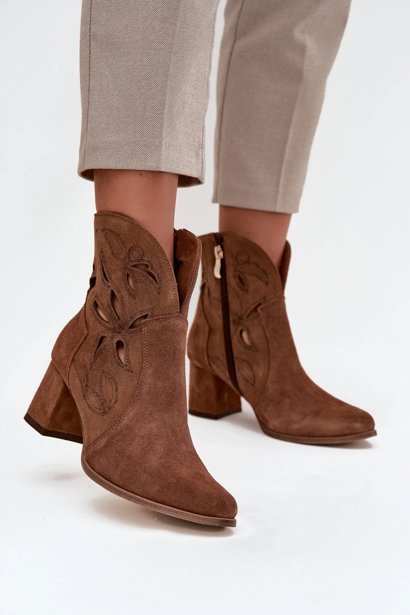 Semišové perforované dámské kotníkové boty na podpatku Zazoo 3647 hnědé