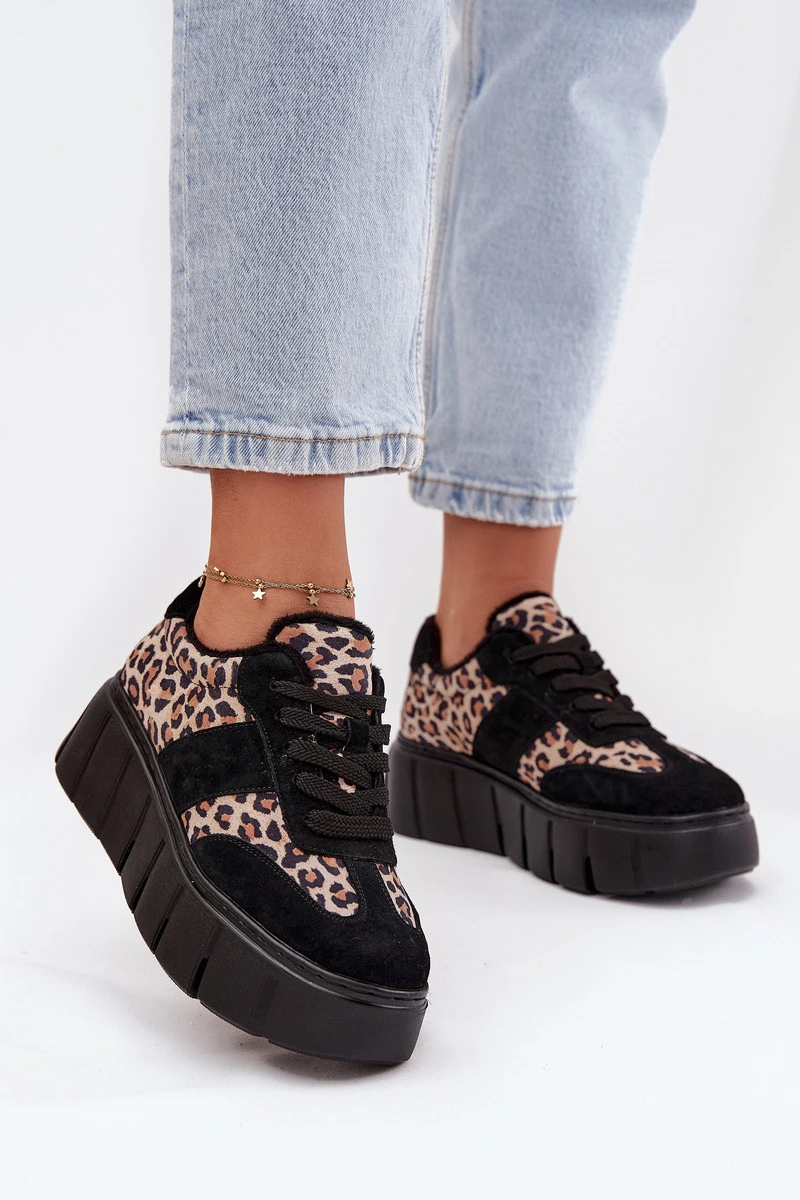 Semišové zateplené dámské tenisky na masivní platformě Vinceza 66841 Panterka Černé