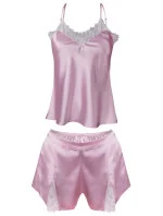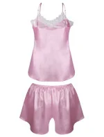 Tato sladká dvoudílná souprava je vyrobena ze saténu a krajky a jistě vás okouzlí jak svou jemnou pastelovou barvou, tak neuvěřitelnou jemností, která je vlastní designu. Souprava se skládá z pohodlného topu na tenkých nastavitelných ramínkách s krásným krajkovým výstřihem a volných šortek na měkkém elastickém pásku s krajkovými vsadkami na stehnech. 100% polyester.