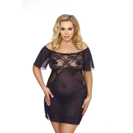 Smyslná noční košilka, dostupná i ve větších velikostech, která zcela odhaluje ramena. Velmi módní střih s elastickým výstřihem. Krásná krajková horní část, spodní část a rukávy ze síťovaného tylu. Střih je pohodlný, pod prsy je správné prošití, aby celek ladně přiléhal. Součástí sady jsou tanga (košilka neobsahuje nálepky bradavek viditelné na obrázku).