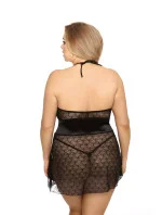 Vzdušná noční košile z elegantní černé krajky. Střih je zvýrazněn saténovým prvkem v pase, díky němuž košilka působí velmi tvarovaně. Výstřih se sexy šněrováním. Popruhy se zavazují za krkem. Tanga jsou součástí balení. Nálepky na bradavky nejsou součástí balení.