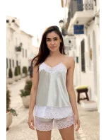 Elegantní dvoudílná souprava Isabella ve stříbrné a bílé barvě. Velmi ženské, svůdné, s bílou smyslnou krajkou, která lehce obepíná výstřih, boky i stehna. Chcete se cítit výjimečně? - Oblečte si toto spodní prádlo. Měkký satén, nádherně naaranžovaný, a krajka vnáší skutečně romantickou náladu.