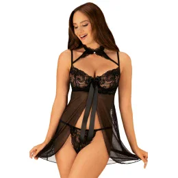 Milujete smyslné noční prádlo? Tady je něco pro vás! Novinka od Obsessive - černá, vzdušná, velmi pohodlná a smyslná noční košilka z černé krajky a vzdušného tylu. Určitě si ji zamilujete... Košilka má krásné profilované košíčky s kosticemi a velkou saténovou mašlí uprostřed modelu. Výstřih je zdoben krásným ornamentem. Měkká tkanina, velmi příjemná na dotek. Zapínání na zadní straně. Tanga jsou součástí balení.