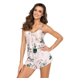 Pyžamová souprava NELLY 1/2, vytvořená s ohledem na horké noci, je vyrobena z hedvábného saténu a poskytuje tělu oddech i v těch nejteplejších chvílích. Košilka je zavěšená na tenkých ramínkách, s hluboce vykrojeným výstřihem, v pase sahajícím až k hýždím. Krátké šortky, s nohavičkami jemně zvednutými na bocích, dosahují délky za hýždě. Souprava ve stříbřitě růžovém odstínu, důmyslně zdobená květinovými motivy. Vyrobeno v Polsku.