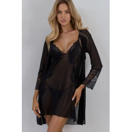 Černý, 3dílný dámský set SAY YES - smyslná elegance pro výjimečné večery. Set SAY YES je nesmírně ženský a smyslný set nočního prádla, vytvořený s ohledem na romantické chvíle. Třídílná kompozice zahrnuje košilku, župan a tanga, vytvářející harmonický a elegantní celek. Košilka s tenkými, nastavitelnými ramínky spojuje lehký, průhledný tyl s jemnou krajkou, decentně zdůrazňuje postavu a dodává stylizaci svůdný charakter. Rozeknutí po stranách, zdobené mašličkami, jí dodává lehkost a ženský šarm. Vzdušný župan z tylu doplňuje set svou jemnou formou. Krajkové zakončení rukávů skvěle ladí s detaily košilky, zdůrazňujíce soudržnost projektu a jeho elegantní styl. Celé doplňují jemné tanga, které posilují smyslný charakter setu. SAY YES je skvělou volbou pro ženy, které oceňují spojení elegance, jemné eleganci a rafinované smyslnosti. Každý model Pure Sin vzniká z prvotřídních materiálů, s důrazem na nejmenší detaily, ideálního přizpůsobení ženské postavě a precizního dokončení. Je to prádlo, které okouzlí svou formou a zajišťuje pohodlí při nošení, protože smyslnost si zaslouží dokonalé provedení.