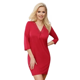 Tričko T!SSi 107 vyzařuje harmonii a diskrétní půvab, je střižené tak, aby volně splývalo kolem těla a lehce zvýrazňovalo křivky. Rukávy 3/4 délky, pohodlné, volně padnoucí. Výrazný výstřih zdobený širokým pruhem lesklé krajky s květinovými motivy. Překrytí mezi prsy, symetrické rozložení materiálu do stran. Košilka sahá do půli stehen. Výrobek zabalený v sáčku s fotografií.