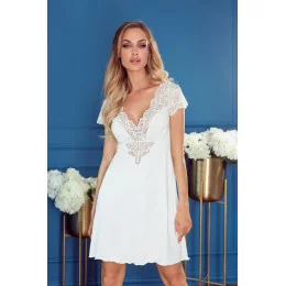 Smyslná noční košilka vytvořená z kombinace viskózy a krajky. Hluboký výstřih do V z bohatě zdobené krajky, krajkové rukávy. Navrženo a ušito v Polsku.