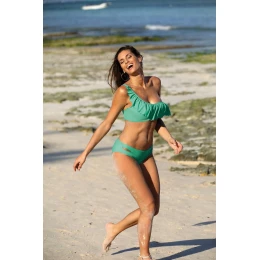Součástí kompletu je podprsenka zavazovaná na zádech, která imituje top na jedno ramínko. Výstřih s velkým, vzdušným volánkem, vyrobený z lehké italské látky, vypadá fenomenálně. Krásné, sváteční barvy. Podprsenka je bez kostic, má tvarované, na vnitřní straně skryté vsadky modelující a zpevňující prsa, díky kterým poprsí vypadá atraktivně. Vsadky lze z modelu vyjmout, čímž vznikne "měkká" verze podprsenky. Kalhotky ve velmi dobré výšce, jsou velmi pohodlné a na bocích je zdobí svůdné prasklinky. Složení: 80 % polyamid, 20 % elastan.